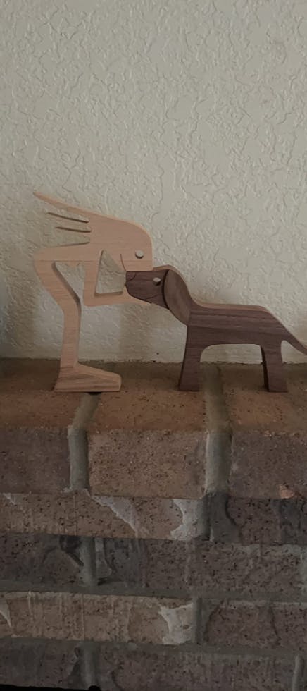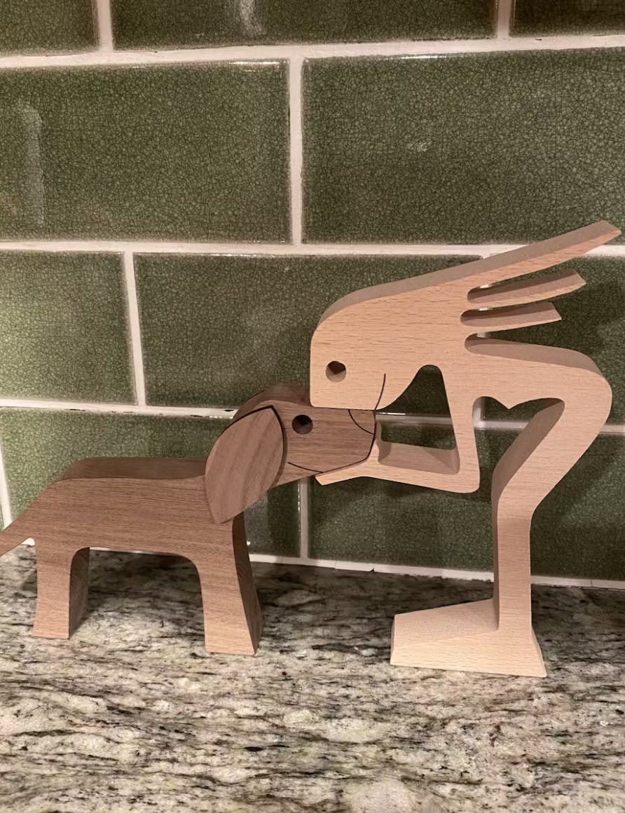 This exquisite wooden sculpture captures the tender bond between a pet owner and their beloved dog. Made from natural beech and walnut wood, the design is a harmonious blend of simplicity and emotion, celebrating the love we share with our furry friends. Whether it's a gift for Mother's Day, a keepsake for dog lovers, or a charming home décor piece, this artwork radiates warmth and artistic elegance.